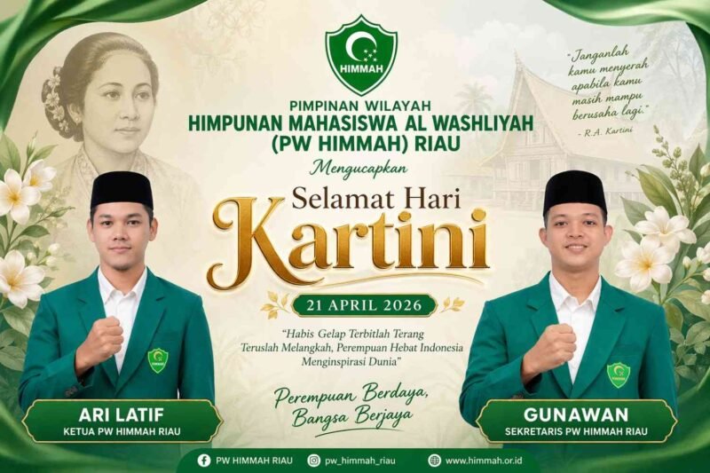RIAUPARK.COM | – Dalam momentum peringatan Hari Kartini yang jatuh pada 21 April 2026, Pimpinan Wilayah Himpunan Mahasiswa Al Washliyah (PW HIMMAH) Riau menyampaikan ucapan sekaligus seruan inspiratif untuk terus menghidupkan semangat perjuangan perempuan Indonesia.