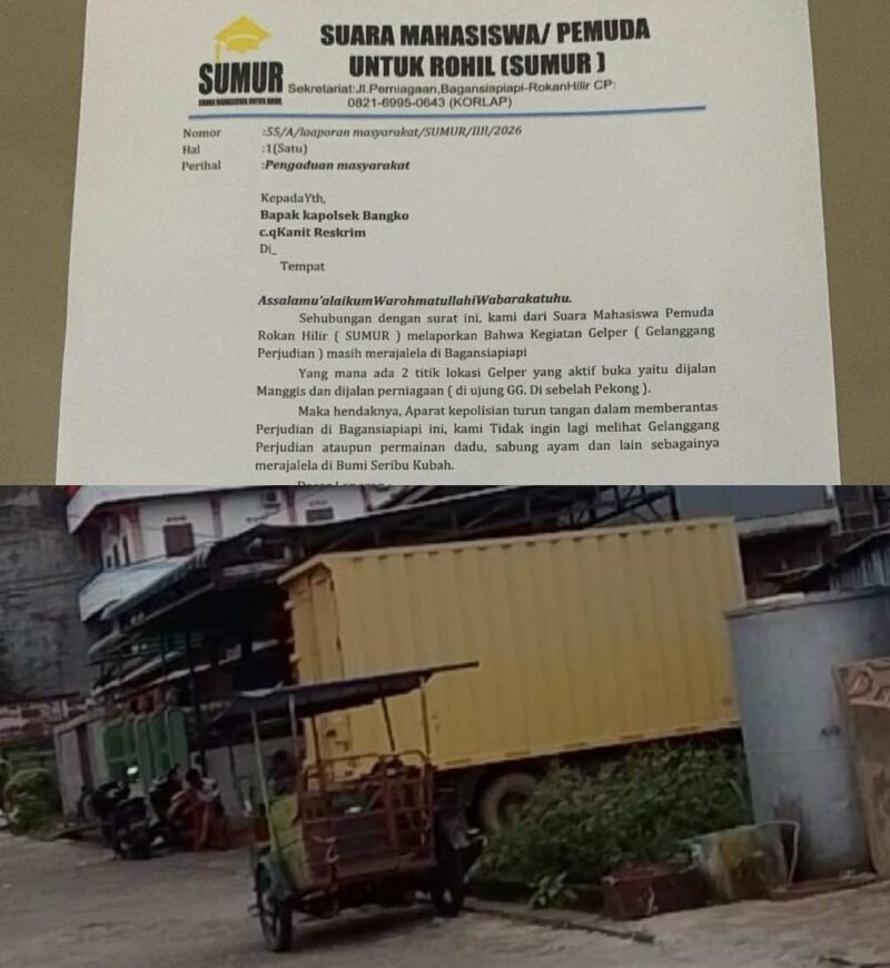 RIAUPARK.COM | ROKAN HILIR – Suara Mahasiswa Pemuda Rokan Hilir (SUMUR) secara resmi melaporkan maraknya aktivitas gelanggang perjudian (gelper) di wilayah hukum Polsek Bangko. Laporan tersebut disertai desakan agar aparat segera mengambil tindakan tegas, dengan tenggat waktu respons selama 3×24 jam, Sabtu (4/4/2026).